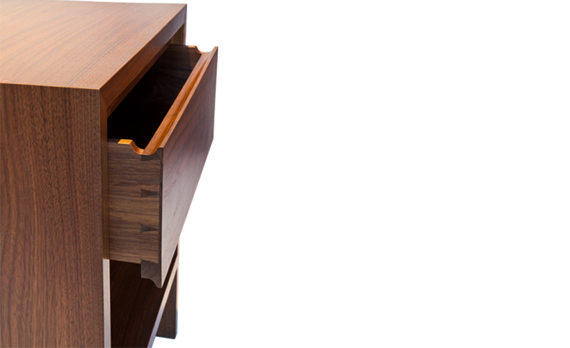 Shaped reveal pull and wooden drawer slide. Mortise and tenon joints.
